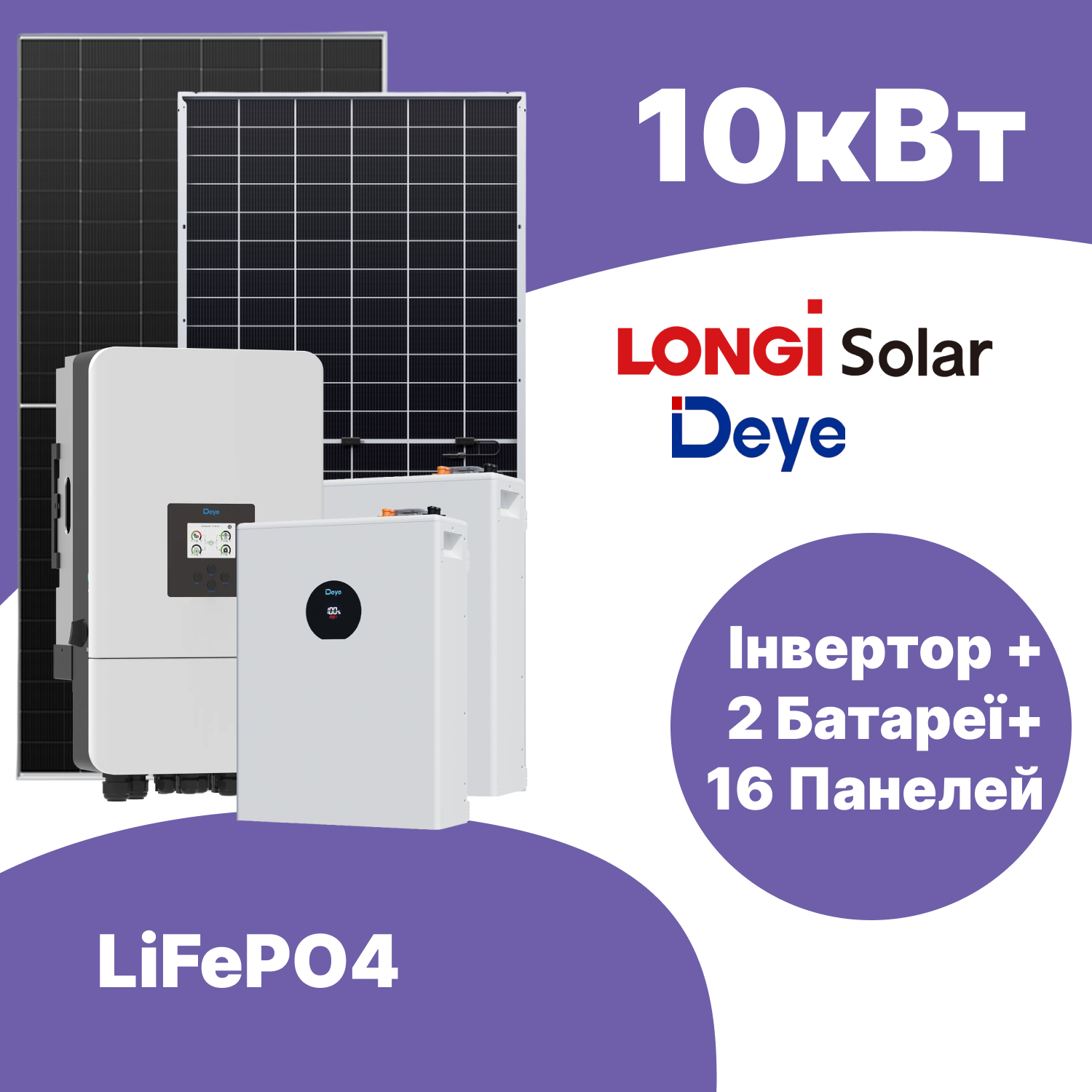 Комплект резервного живлення: інвертор Deye SUN-10K-SG05LP3 10KW, 3Ф, IP65, Wi-Fi + 2 акумулятори 51.2v DEYE Pro-C 5.12kWh, 100Ah LiFePo4 + 16 штук сонячних панелей Longi LR8-66 HGD-610M Bifacial