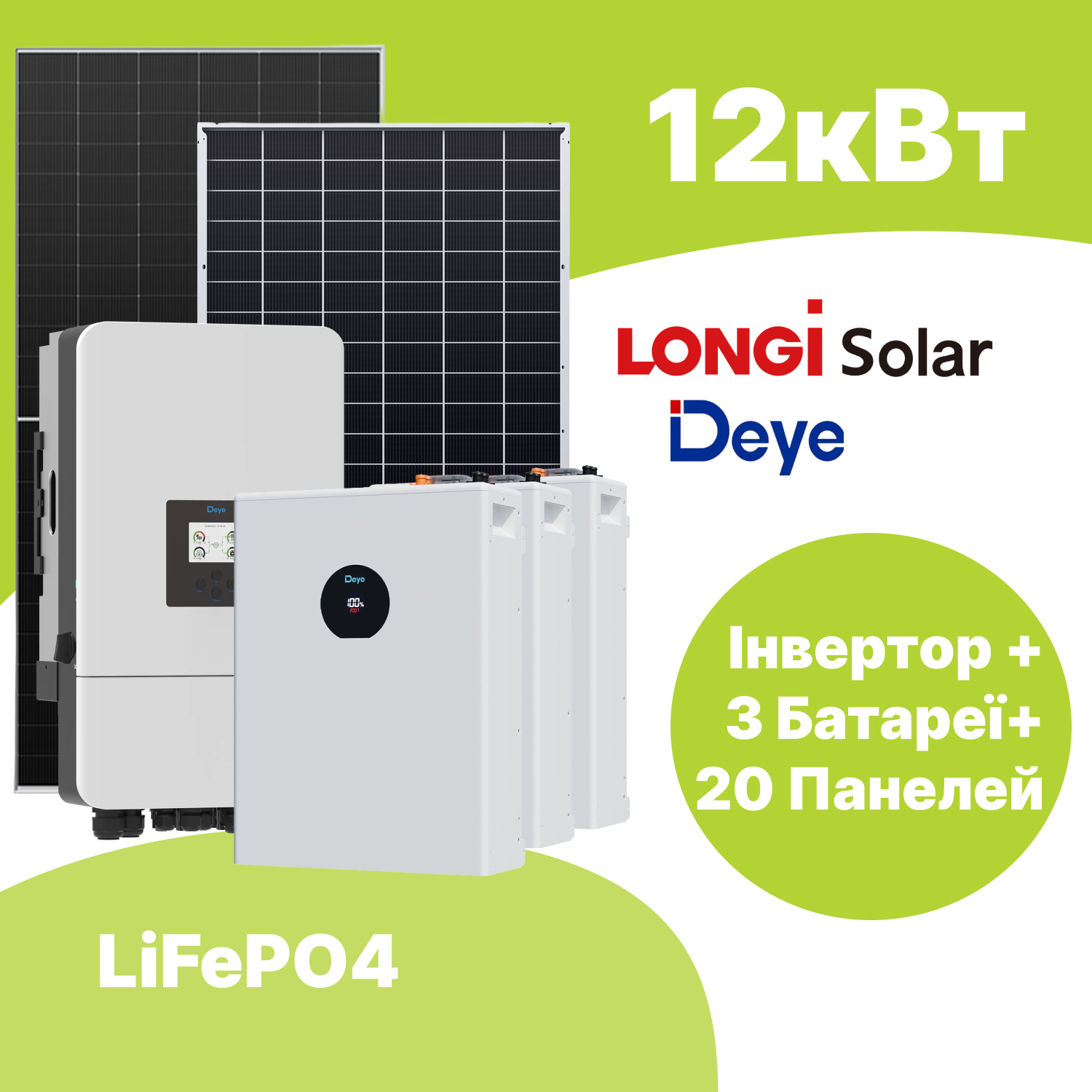 Комплект резервного живлення: інвертор Deye SUN-12K-SG05LP3 12KW + 3 акумулятори 51.2v DEYE Pro-C 5.12kWh, 100Ah LiFePo4 + 20 сонячних панелей Longi LR8-66 HGD-610M Bifacial
