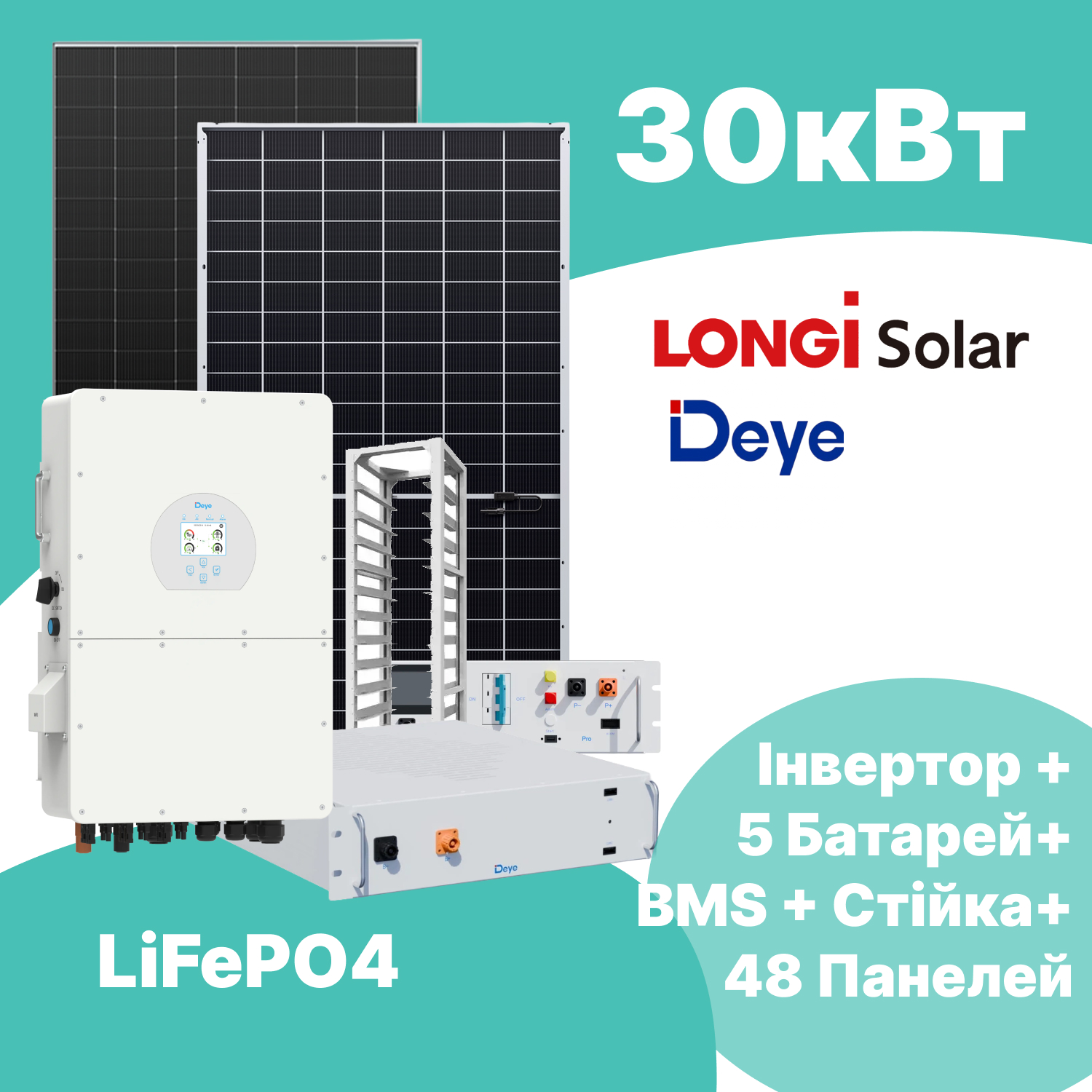 Комплект резервного живлення: інвертор Deye SUN-30K-SG02HP3-EU-AM3 + 5 акумуляторів Deye BOS-G Pro LiFePO4 + BMS Deye BOS-G-PDU-2 + Стійка Deye 3U-HRACK + 48 панелей Longi LR8-66 HGD-610M Bifacial.