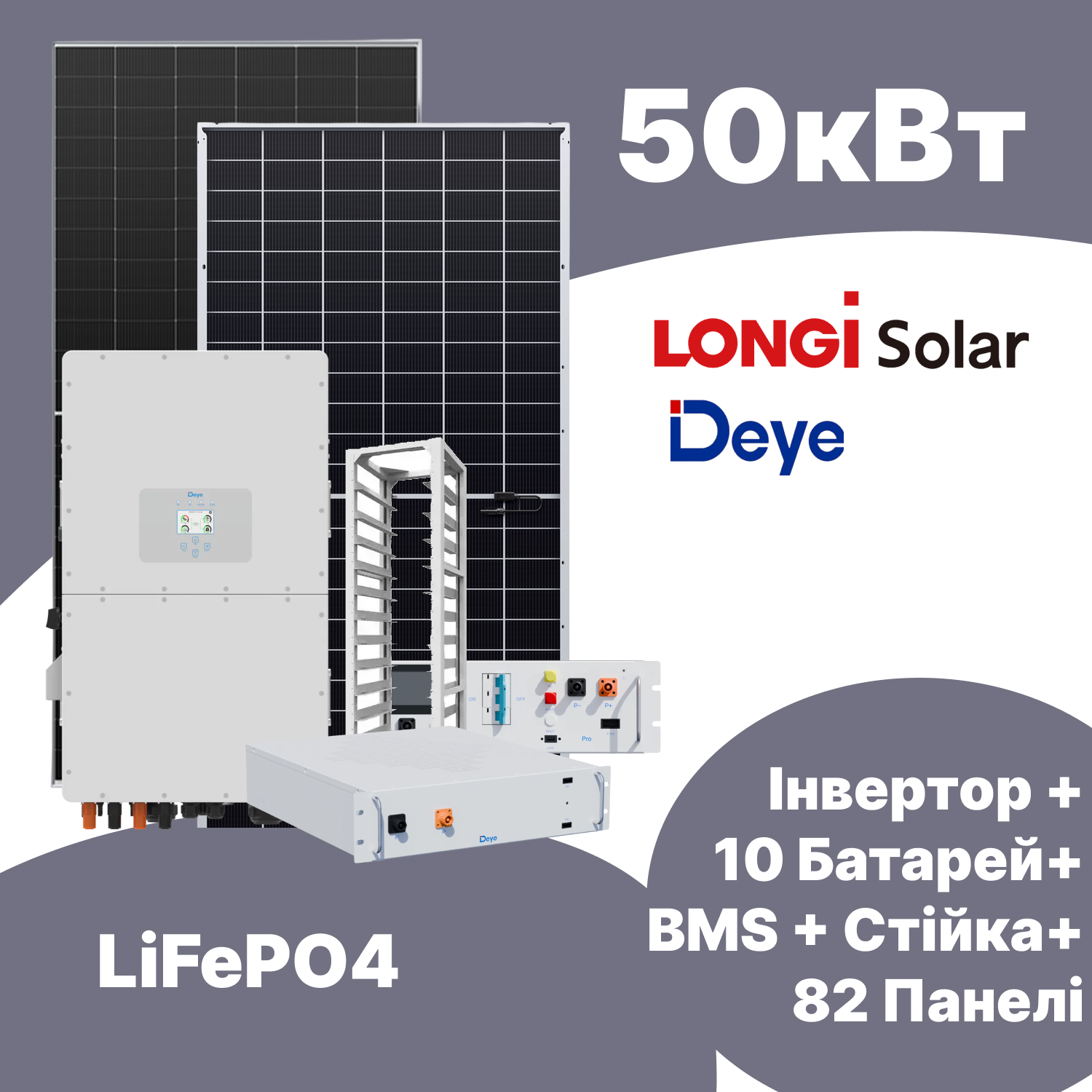 Комплект резервного живлення: інвертор Deye SUN-50K-SG01HP3-EU-BM4 + 10 акумуляторів Deye BOS-G Pro LiFePO4 + BMS Deye BOS-G-PDU-2 + Стійка Deye 3U-HRACK + 82 панелі Longi LR8-66 HGD-610M Bifacial