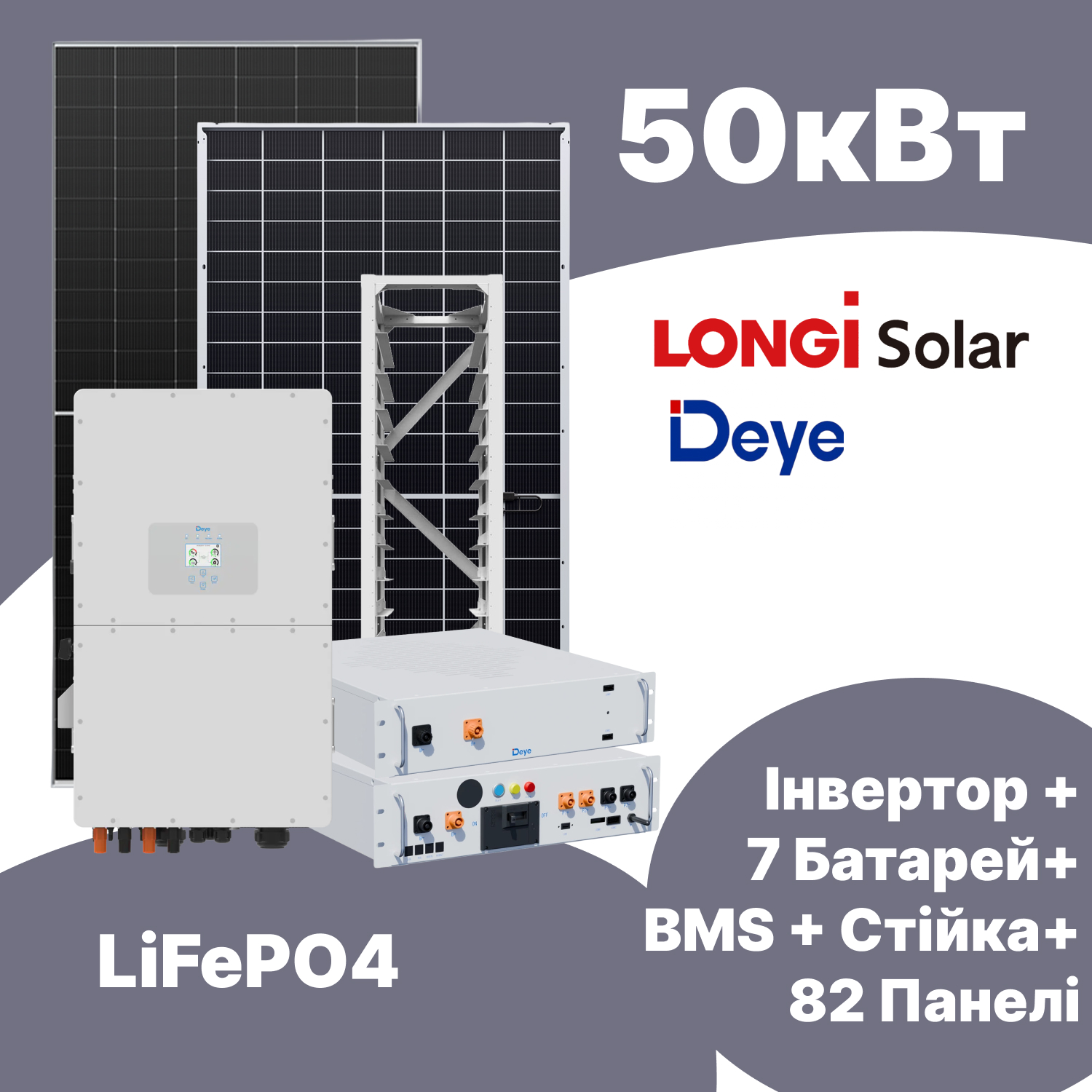 Комплект резервного живлення: інвертор Deye SUN-50K-SG01HP3-EU-BM4 + 7 Акумуляторів Deye-BOS-A-7.68 kWh + BMS Deye -BOS-A-PDU2 + Стійка Deye BOS-A-14er-HRACK + 82 панелі Longi LR8-66 HGD-610M Bifacial