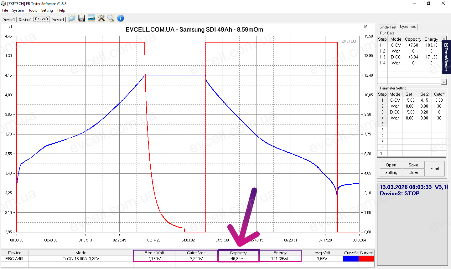 • Діапазон 4.15v – 3.2v: 46.84Ah