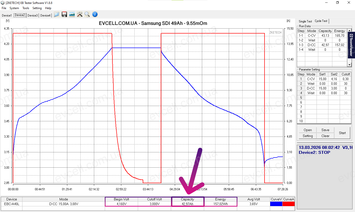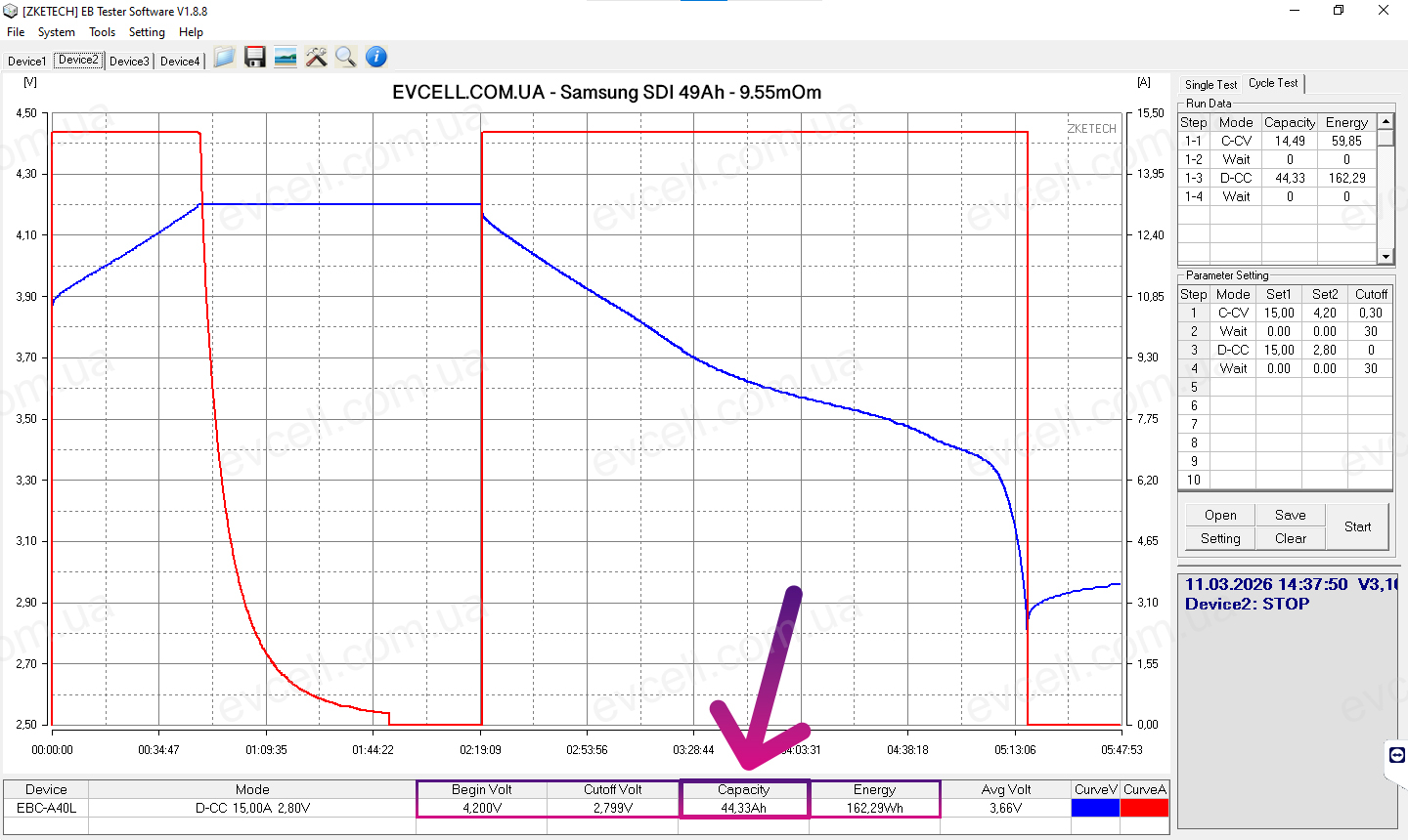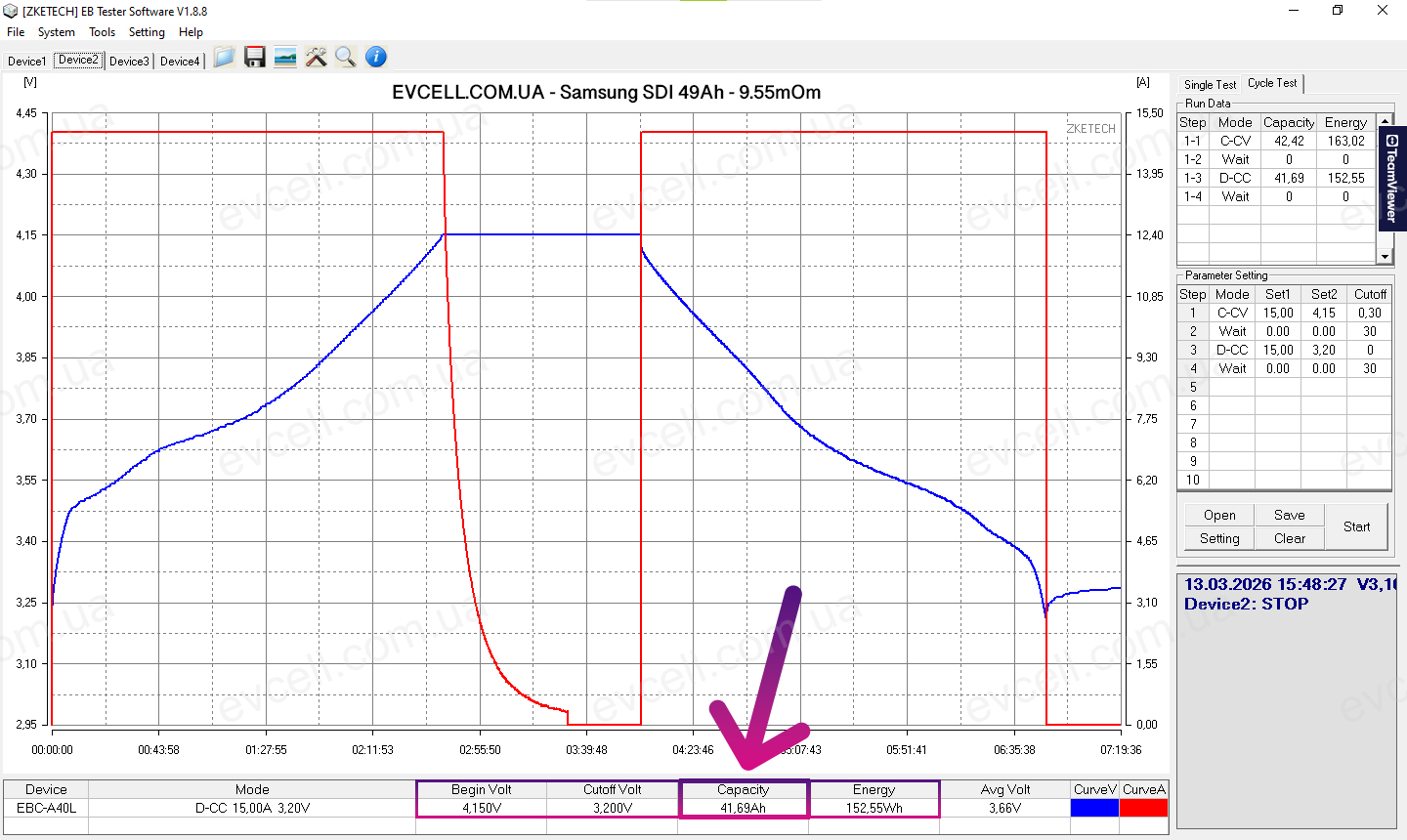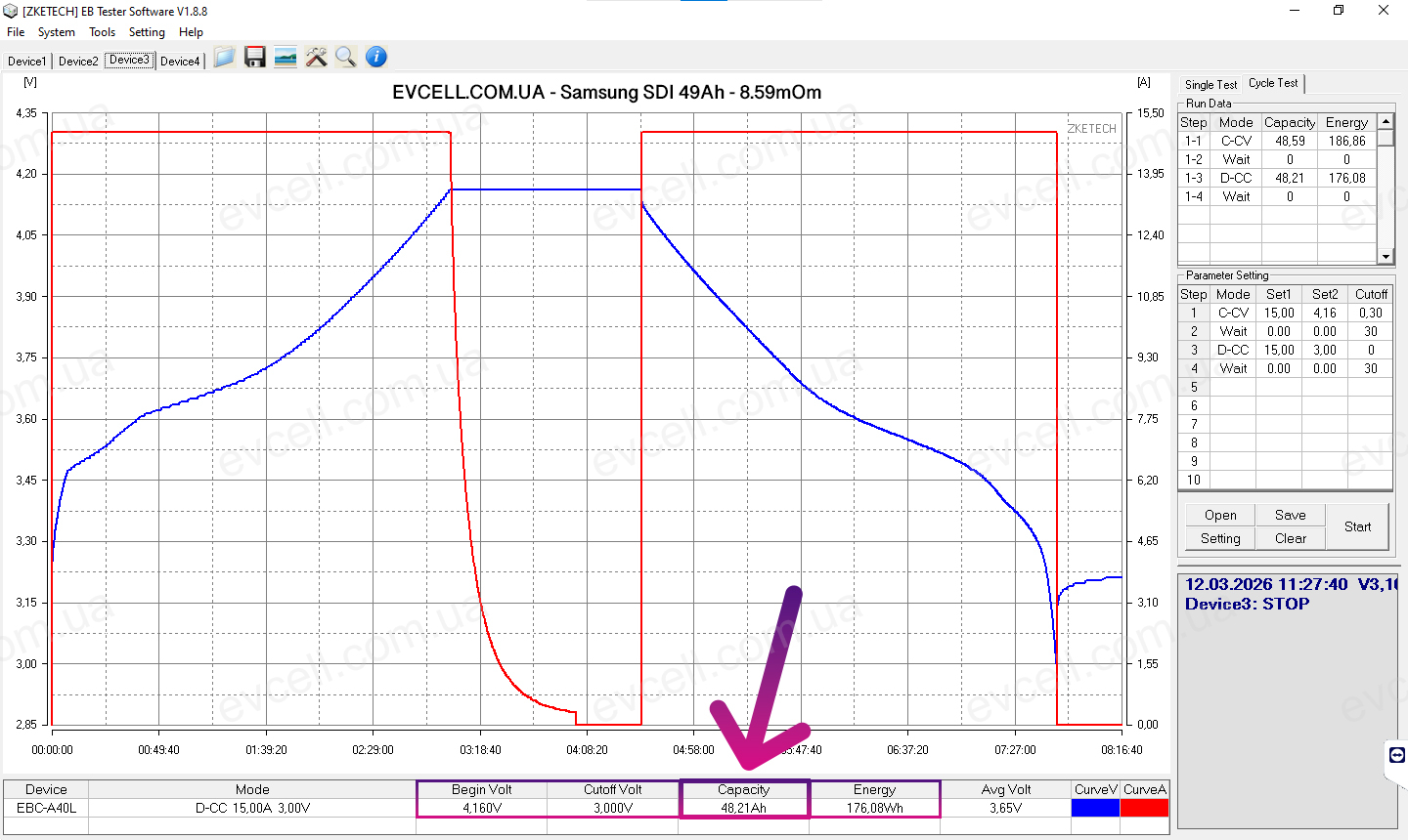 • Діапазон 4.16v – 3.0v: 48.21Ah