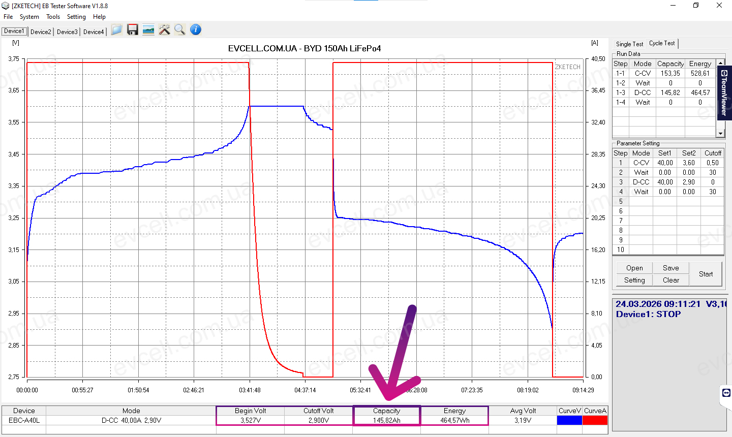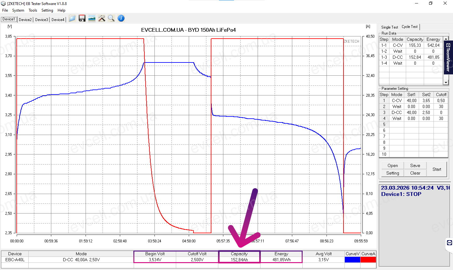 • Діапазон 3.65v – 2.5v: 152.84Ah